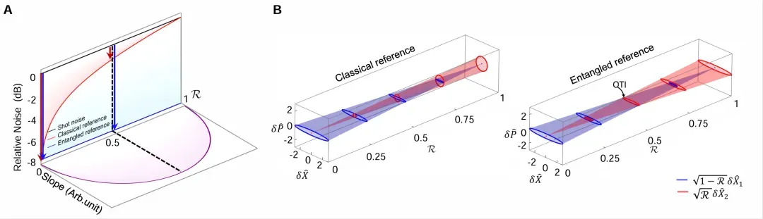 為突破此局限,團隊構(gòu)建了互為糾纏的“量子孿生干涉儀”,取代現(xiàn)有的平衡零拍探測?;诓⑿信渲玫碾p對孿生糾纏光束,團隊建立了量子關(guān)聯(lián)干涉與糾纏探測協(xié)同的相位測量新范式。這一成果成為量子計量學向前邁進的又一里程碑。