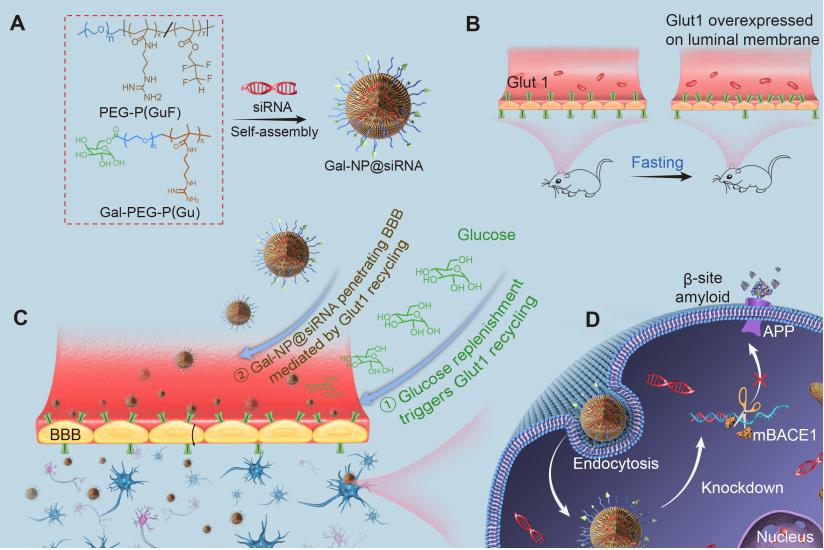 基于以上背景,河南大學(xué)-麥考瑞大學(xué)生物醫(yī)學(xué)聯(lián)合創(chuàng)新中心開發(fā)了一種糖基化三重作用力穩(wěn)定的高分子siRNA納米藥物(Gal-NP@siRNA),用于靶向APP/PS1轉(zhuǎn)基因阿爾茨海默癥小鼠模型中的BACE1。Gal-NP@siRNA具有良好的血液穩(wěn)定性,同時利用血糖控制BBB內(nèi)皮細(xì)胞上葡萄糖轉(zhuǎn)運蛋白Glut1的運轉(zhuǎn)來促進siRNA納米藥物對BBB的滲透,從而確保siRNA有效降低BACE1表達(dá)和淀粉樣斑塊的聚集,抑制磷酸化Tau蛋白的產(chǎn)生,并促進髓鞘再生。動物實驗結(jié)果顯示,Gal-NP@siBACE1恢復(fù)了阿爾茨海默癥模型小鼠退化的認(rèn)知能力,且沒有明顯的副作用。