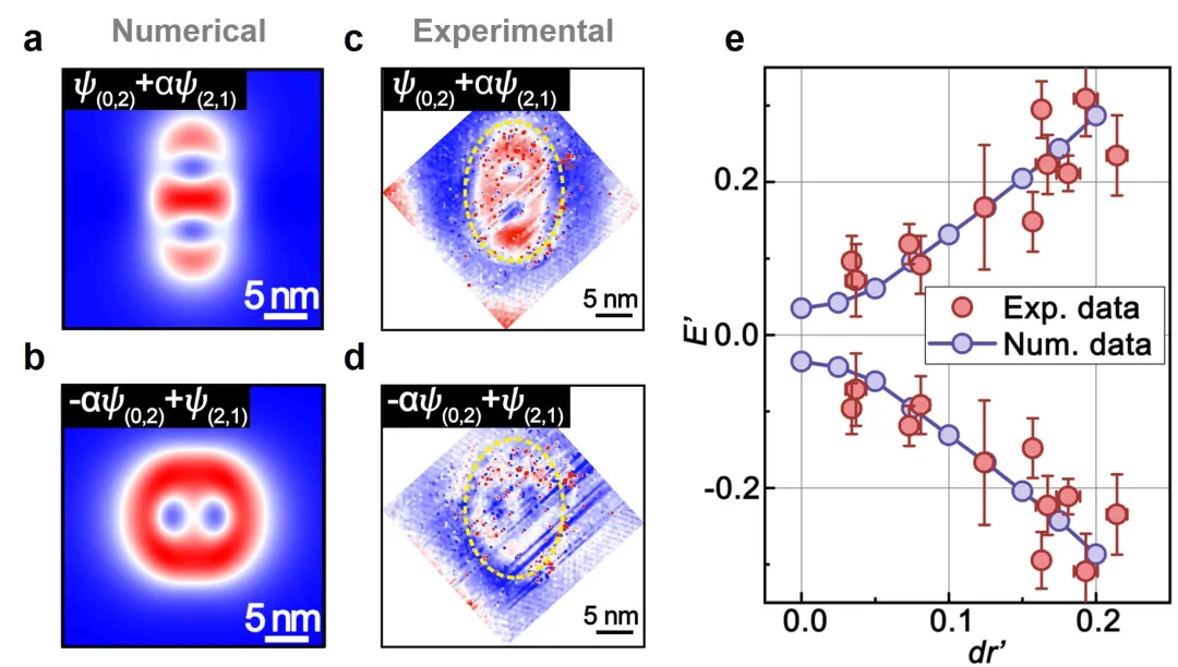 該研究指出,如果在石墨烯量子點中將圓形勢場變形為橢圓形勢場,軌道量子數(shù)為0的s軌道和軌道量子數(shù)為2的d軌道之間將會發(fā)生雜化,重新組合成兩個新的雜化態(tài)。孫慶豐教授課題組從解析推導(dǎo)和數(shù)值計算兩方面得到了雜化態(tài)的形狀(圖2a,b,θ形和倒θ形)。何林教授課題組在實驗上利用掃描隧道顯微鏡(STM)針尖操縱技術(shù),開發(fā)了制備具有不同各向異性程度量子點的方法,并對其中的受限態(tài)進(jìn)行了系統(tǒng)探測,直接觀測到了量子點受限態(tài)的軌道雜化特征(圖2c,d)。
