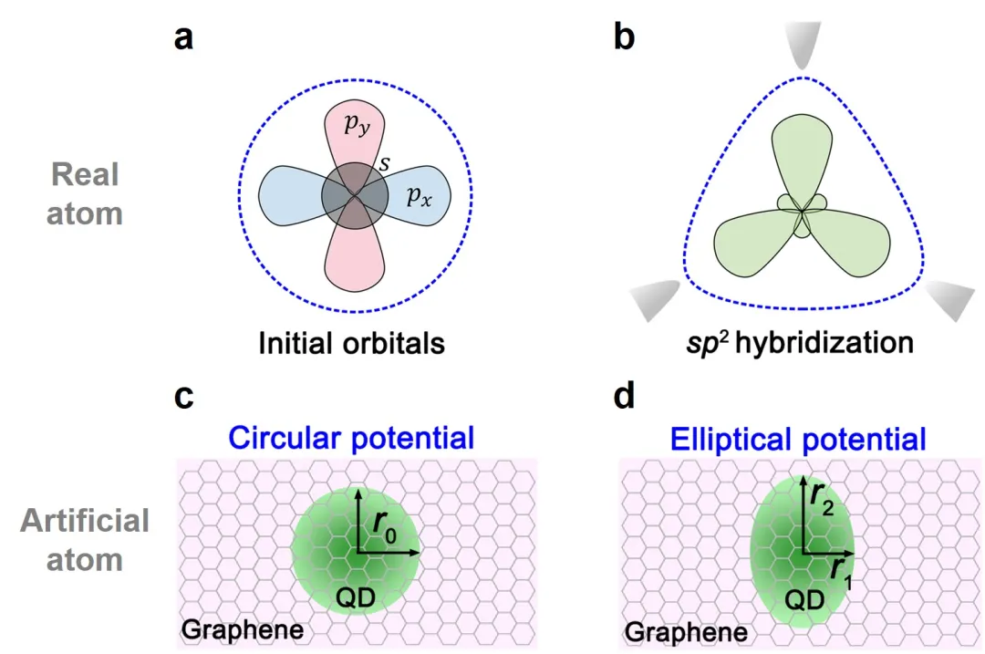 針對這一空白,何林課題組與孫慶豐課題組深入合作,發(fā)展了人造原子中軌道雜化的概念,提出人造原子的各向異性勢可以讓其能量相近的不同軌道受限態(tài)之間發(fā)生雜化(圖1)。