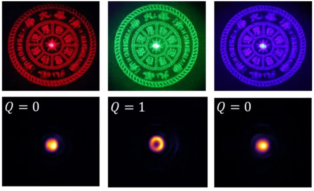 BIC處實(shí)現(xiàn)波前調(diào)控。通過幾何相位編碼形成的全息圖具有寬帶特性(上),而由BIC拓?fù)洚a(chǎn)生的渦旋光具有窄帶特性
