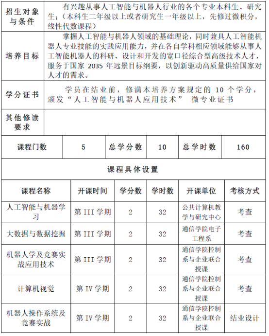 學(xué)員在完成學(xué)習(xí)前,修滿本培養(yǎng)方案規(guī)定的10個(gè)學(xué)分,頒發(fā)“人工智能與機(jī)器人應(yīng)用技術(shù)”微專業(yè)證書(shū)